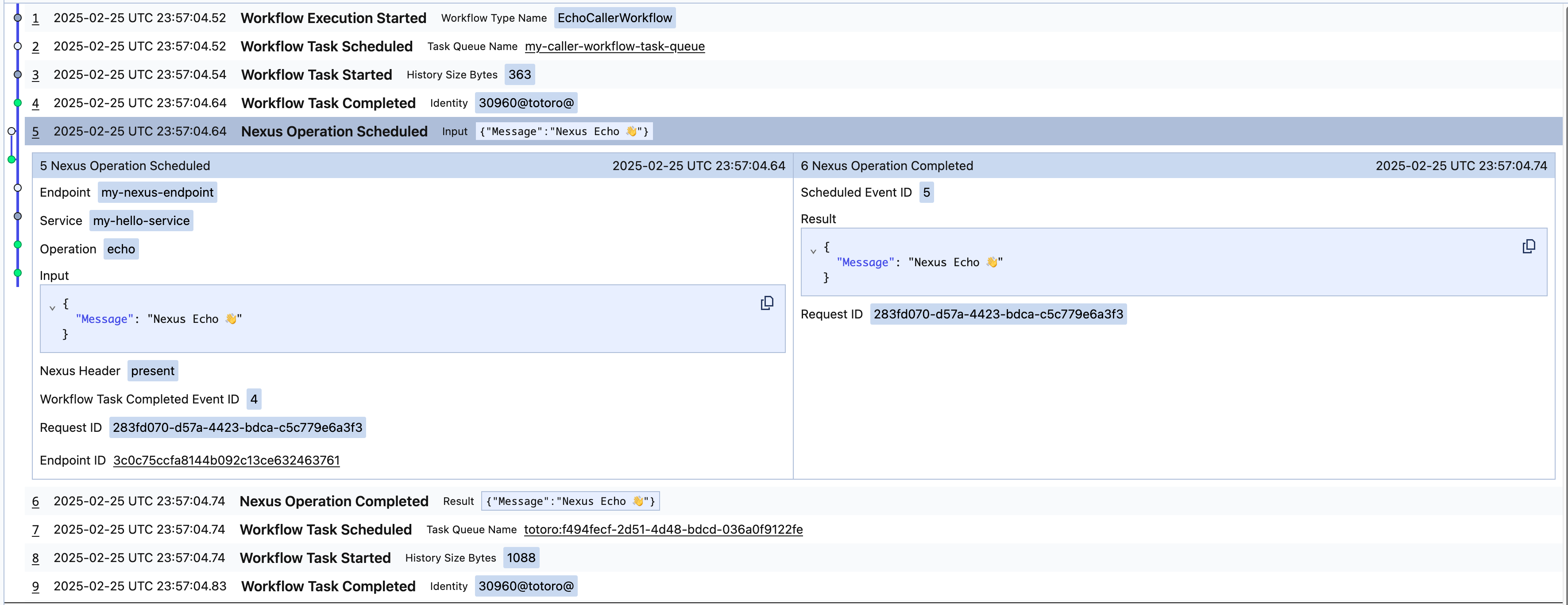 An asynchronous Nexus Operation will surface in the caller Workflow as follows, with NexusOperationScheduled, NexusOperationStarted, and NexusOperationCompleted, in the caller's Workflow history: